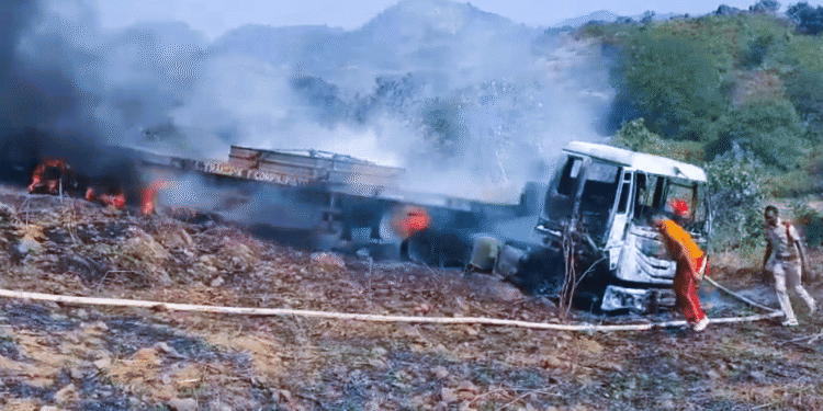 The heavy vehicle plunged down the ghat and immediately caught fire, sending plumes of smoke into the sky.