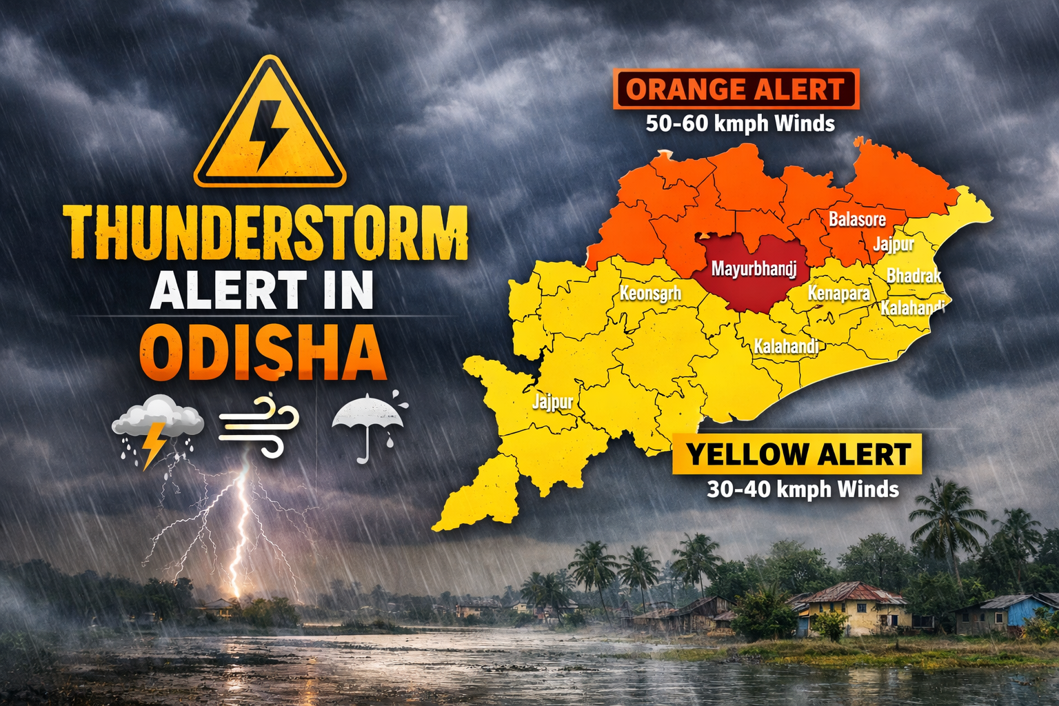 Orange Warning has been issued for Mayurbhanj and Balasore, where wind speeds may reach 50–60 kmph accompanied by lightning. Yellow Warning has been declared for Sundergarh, Keonjhar, Bhadrak, Jajpur, Kendrapara, Kalahandi, Koraput, and Malkangiri, with gusts of 30–40 kmph.